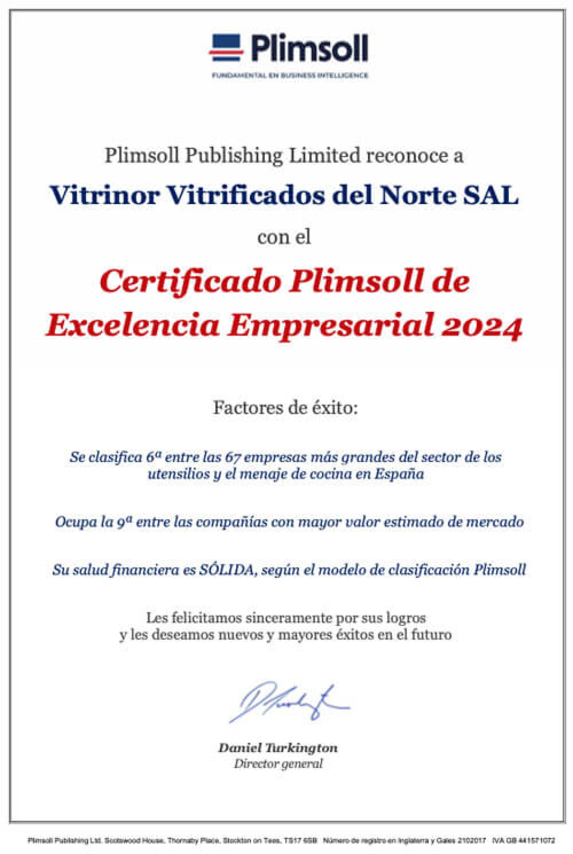 La última edición del informe sectorial Plimsoll Utensilios y menaje de cocina (España) certifica que Vitrinor,
